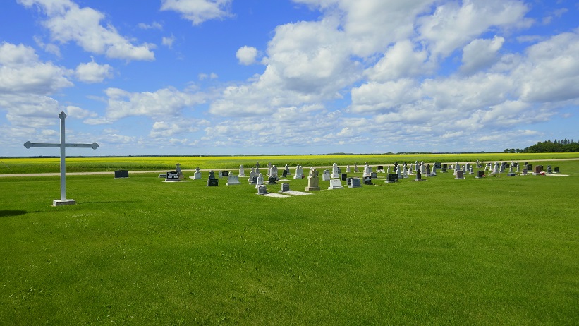 This section of the cemetery sits next to a canola field. The graves face eastward meaning the inhabitants get to watch the sunrise over the bright yellow blooms on summer mornings.