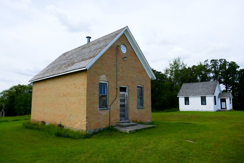 A red-brick one-room schoolhouse near Woolchester, Alberta.